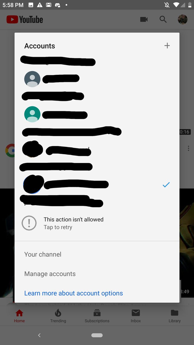 @TeamYouTube When I click to switch to the account it does nothing and brings me back to this screen. The account in question is the very bottom one. pic.twitter.com/RMrTSGtUjkpic.twitter.com/IotkJIV1Yv
