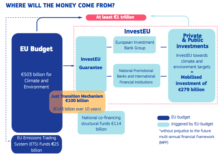 For the rest: €279 billion in private investments under the InvestEU program. €114B in national co-financing and €100B from a Just Transition Mechanism over the next seven years, and here’s where it gets even more complicated than the below graphic by the Commission. 4/pic.twitter.com/lPMFJ4Ygcl
