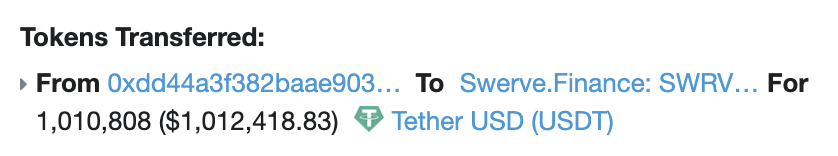 Somebody has just sent 1,010,808 USDT directly to $SWRV address. Now, that's pain.