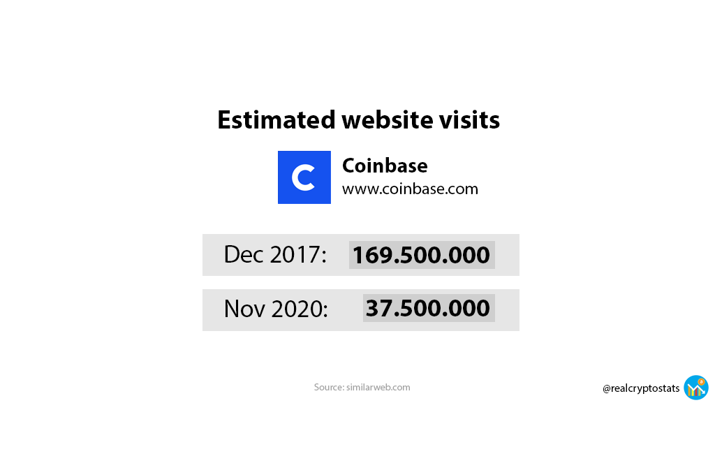 have a look at these numbers too: Bitfinex Dec 2017: 59.3m Dec 2020: 2.9m Binance Dec 2017: 191.5m Dec 2020: 56.3m According to similarweb