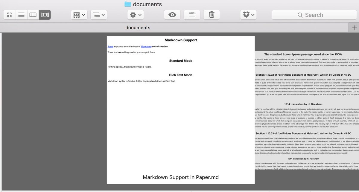 Paper ships with a QuickLook plugin giving instant previews of Markdown document in Finder and many other apps!