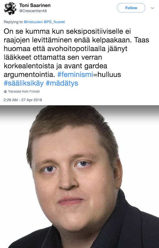 #PSnuoret edustajiston puheenjohtaja Toni Saarinen vain alleviivaa kommentillaan miten ala-arvoista tämän porukan käytös on. Tämä siis kommenttina naiselle, joka kritisoi "Rajat kiinni, raajat auki" -tempausta. --> https://twitter.com/Crescentian48/status/989797983221964800 … --> https://www.facebook.com/toni.m.saarinen pic.twitter.com/Rr5ihYS7mz