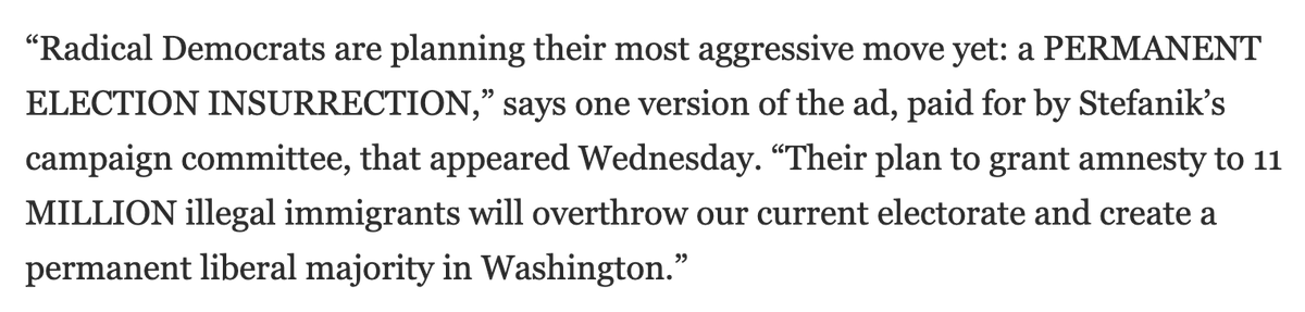 Replacement theory, now in Elise Stefanik's campaign ads https://www.washingtonpost.com/powerpost/rep-stefanik-claims-in-ads-that-democrats-are-seeking-a-permanent-election-insurrection-by-providing-pathways-to-citizenship/2021/09/16/7372011a-16eb-11ec-a5e5-ceecb895922f_story.html …pic.twitter.com/myXrwBmaOC