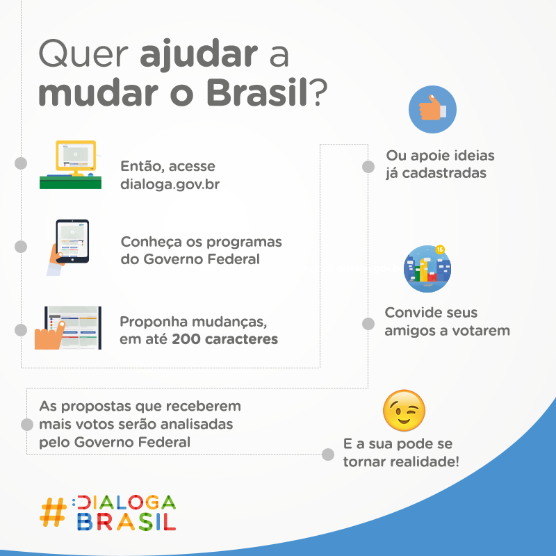 Convide seus amigos, confiram as propostas disponíveis e proponham ideias em http://dialoga.gov.br .