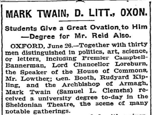 Mark Twain was given an honorary degree by Oxford University, on this day in 1907. "He was applauded for a quarter of an hour," The Times wrote. https://nyti.ms/2IIHzgI pic.twitter.com/1GYZErV9UH