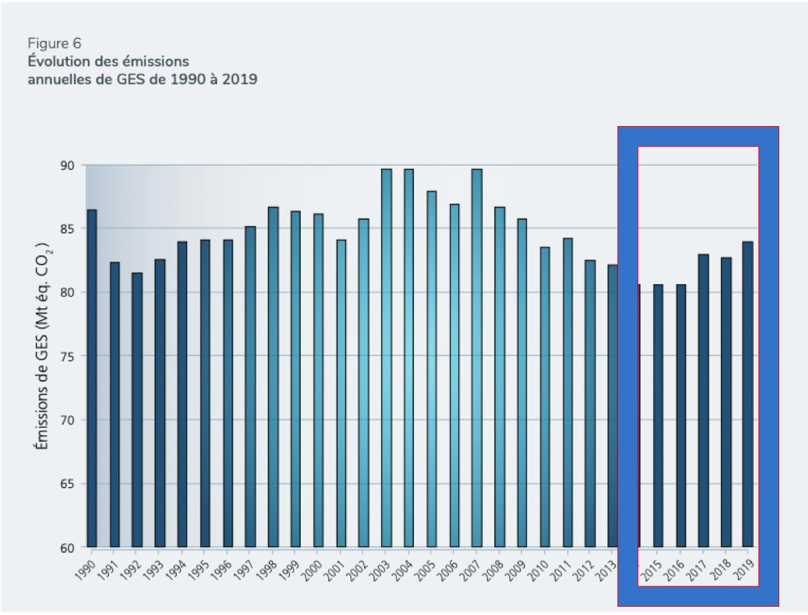 Selon le dernier inventaire pour 2019, les émissions de GES du Québec ont augmentée de 4,2% depuis 2015, soit l'année de l'Accord de Paris ! Après avoir raté les objectifs de Kyoto, le Qc ratera lamentablement sa cible 2020