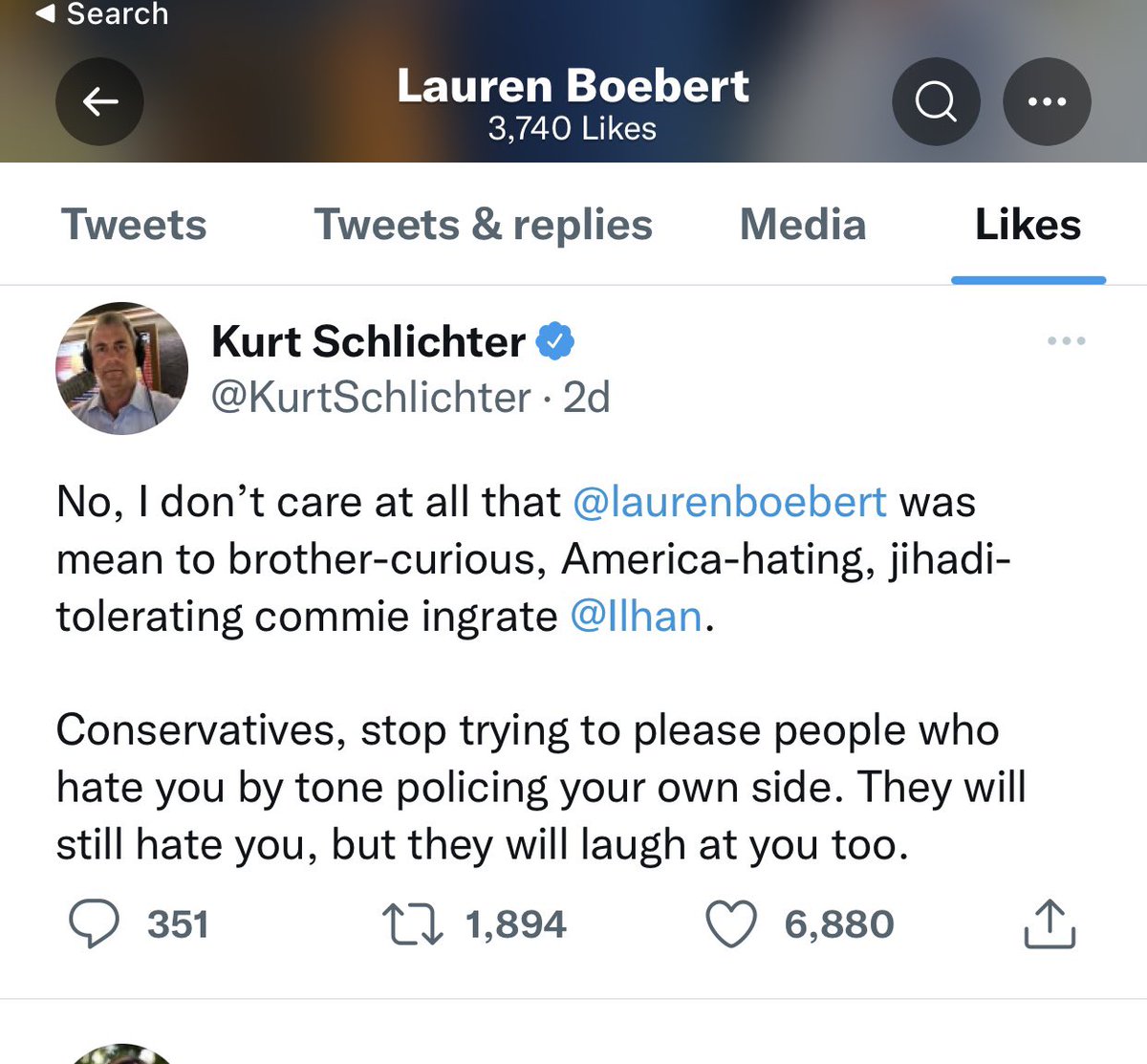 Lauren Boebert liked a tweet defending her attack against on Ilhan Omar.https://twitter.com/patriottakes/status/1465320587878936579 …
