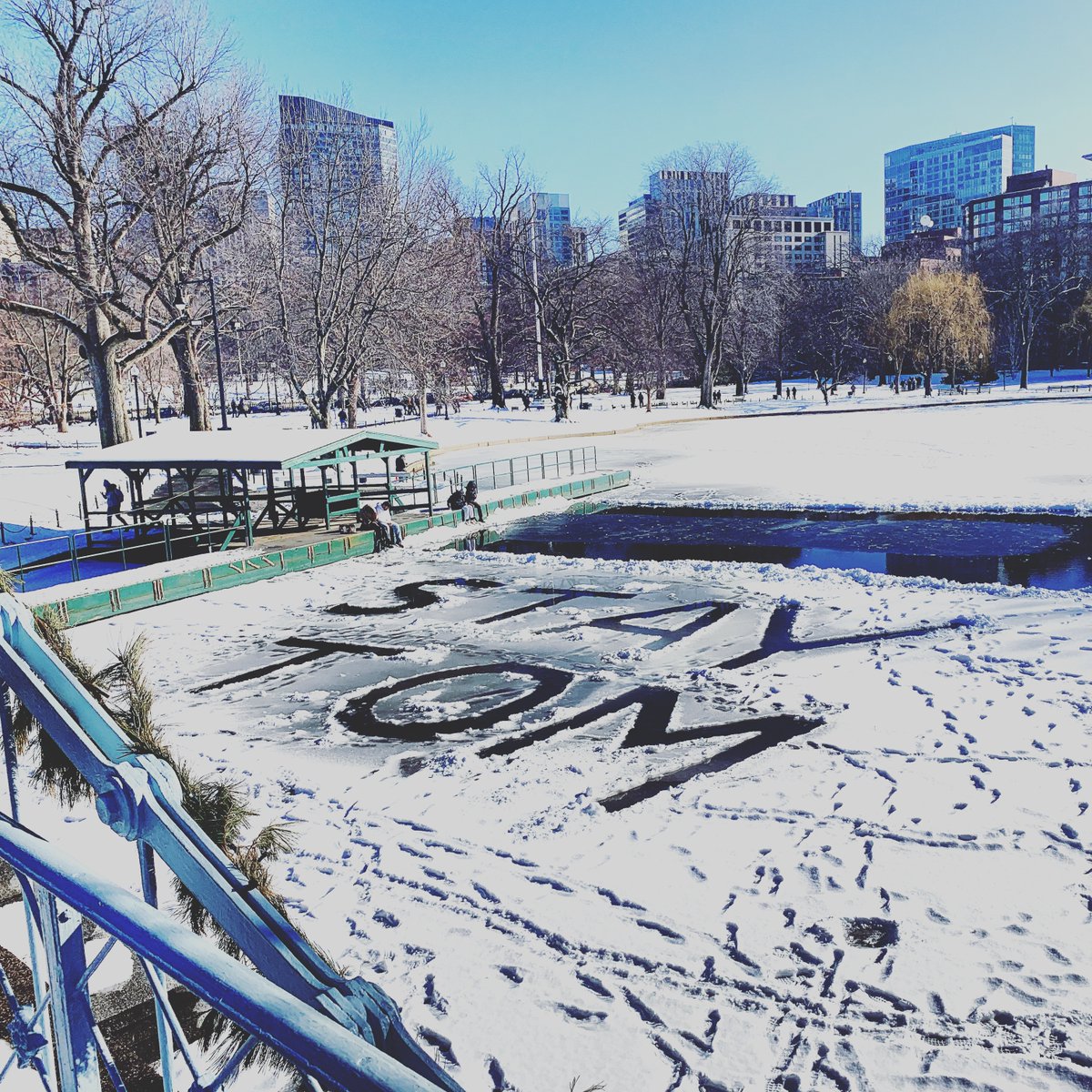 Someone has written STAY TOM on the Boston Public Garden lagoon.