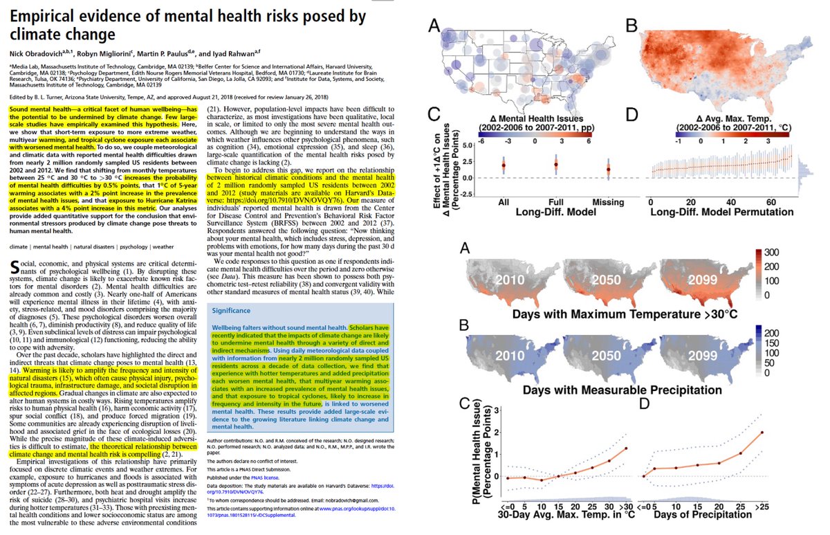 The impact of climate change on mental health, #depression http://www.pnas.org/content/early/2018/09/25/1801528115 … @PNASNews by @medialab's @Nick_Obradovich, R Migliorini, @mpwpaulus @iyadrahwan @scalablecoop @BelferCenterpic.twitter.com/5JpKbAUinG