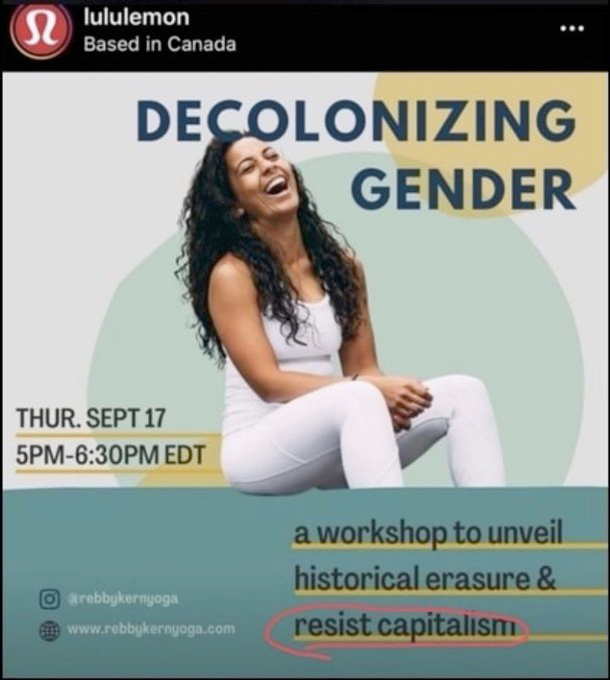 Lululemon is holding a workshop to "decolonize gender" and "resist capitalism".pic.twitter.com/CB14uPB3cq