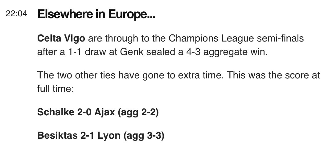 Celta Vigo are through to the Champions League Semi-Final according to the BBC