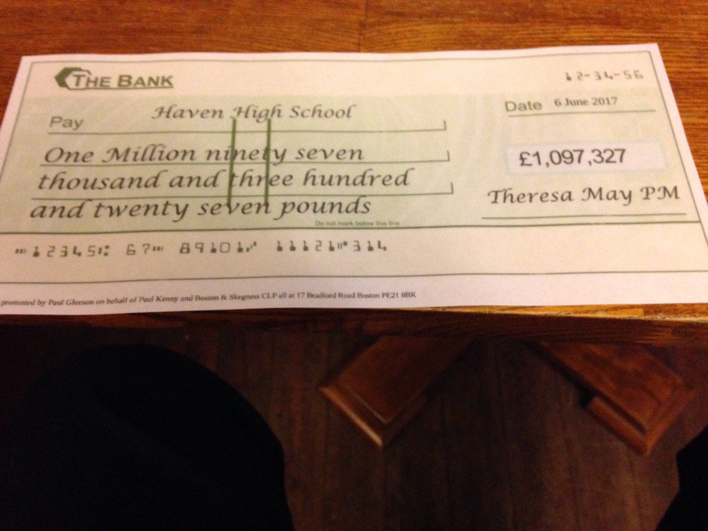 Local Tory candidate supports taking £1M from Haven High by 2020. Will the PM honour this cheque. Shamefully NOpic.twitter.com/a4ckFaEE3a