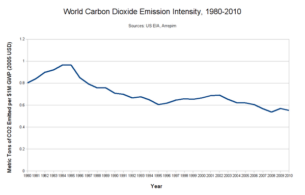 World Carbon Dioxide Emission Intensity, 1980-2010, from http://www.eia.gov/cfapps/ipdbproject/iedindex3.cfm?tid=90&pid=44&aid=8&cid=regions&syid=1980&eyid=2011&unit=MMTCD … and http://stats.areppim.com/stats/stats_tradexgdp_48x10.htm … (updated)pic.twitter.com/R4A0f7y1gf