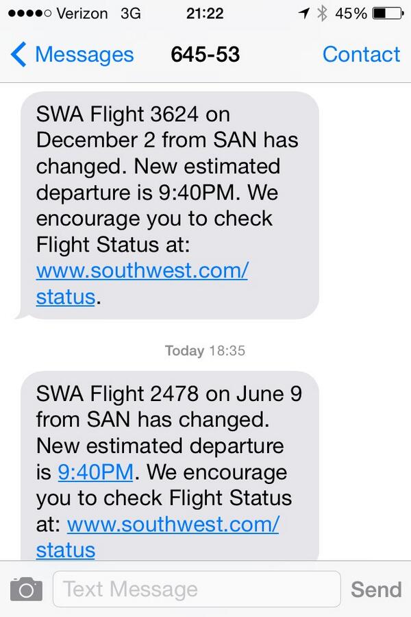 Heh. My two most recent text messages from Southwest, 7 months apart:pic.twitter.com/KPc66696fI