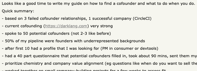 I still haven't written my "how to find a cofounder" notes from two years ago that everyone asks me for, but a summary: https://news.ycombinator.com/item?id=20408026 …pic.twitter.com/qR8aNGoVI4