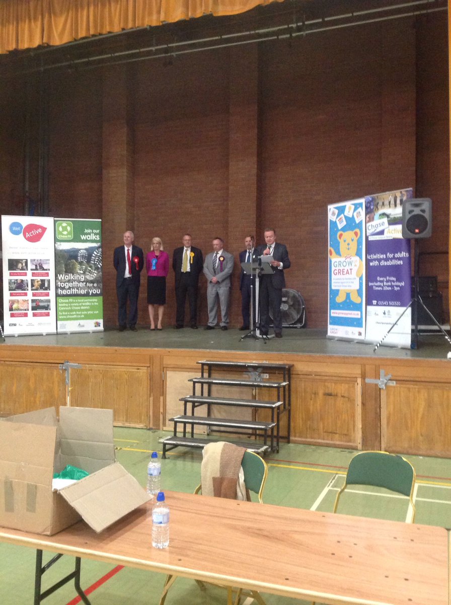 RESULT in Cannock Chase: ALLEN(UKIP) 2,018 DADGE(LAB) 17,927 GREEN(LIBDEM) 794 MILLING(CONS) 26,318 (ELECTED) WOODHEAD(GREEN) 815