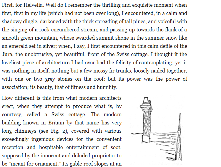 Not sure if you're familiar with Victorian art critic John Ruskin, he practiced the type of 'instructive' criticism that you seem to like. For example this passage where he praises Swiss cottages then explains why the British don't build them properly:pic.twitter.com/Ugcgfab3Dq