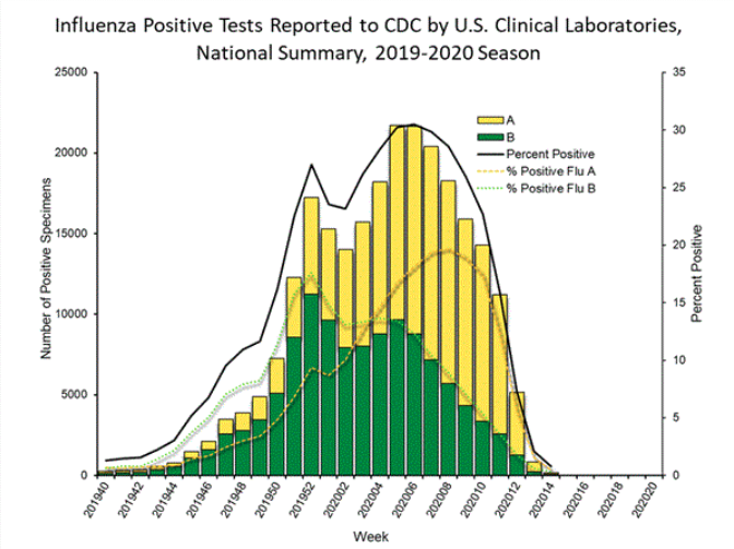 A silver lining from #covid19: influenza season has come to a screeching halt in the US, due to the social distancing that's protecting us from Covid. From today's CDC report: