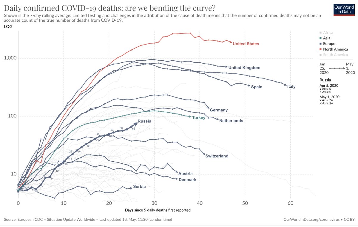 All our #COVID19 charts & data updated for today Friday 1st May: http://OurWorldInData.org/coronavirus  ¯ Many countries have reached a peak in the number of confirmed deaths. But in Russia the number of deaths keeps rising.pic.twitter.com/C2Hi9H8two