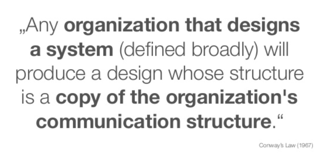 Conway's Law: Any organization that designs a system (defined broadly) will produce a design whose structure is a copy of the organization's communication structure