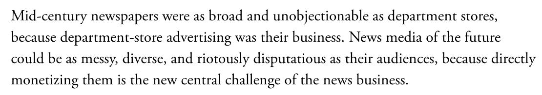 agree w/ Paul. In the 20th century, newspapers were in the department store-advertising business. Now they're in the subscription biz. Readers are more partisan than department stores, and we should expect news media's ideological shift to reflect its business model change.pic.twitter.com/nqgBwGtxP8