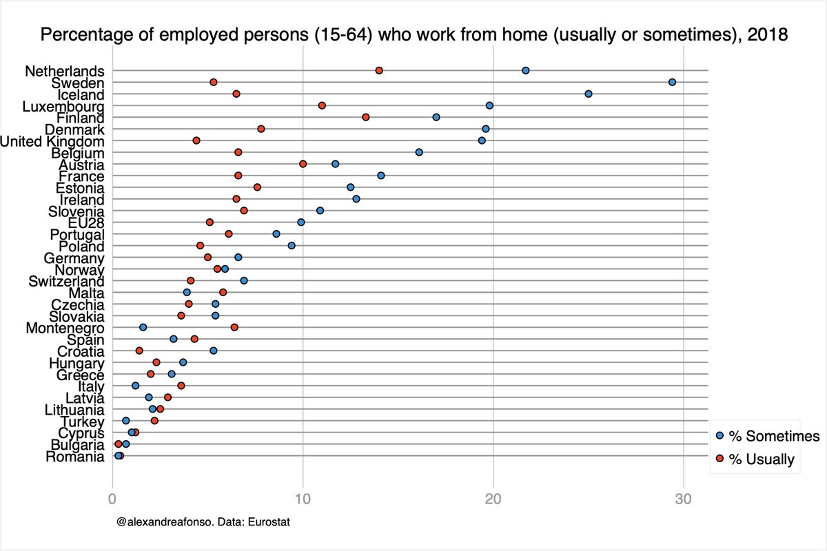 So maybe Nordic countries as a whole are the control group with social distancing mostly based on recommendations (vs coercion in ES, IT, FR, UK for instance). Probably helped by high public trust in government + high % of remote work BEFORE the crisis:https://twitter.com/alexandreafonso/status/1245070113633681410 …