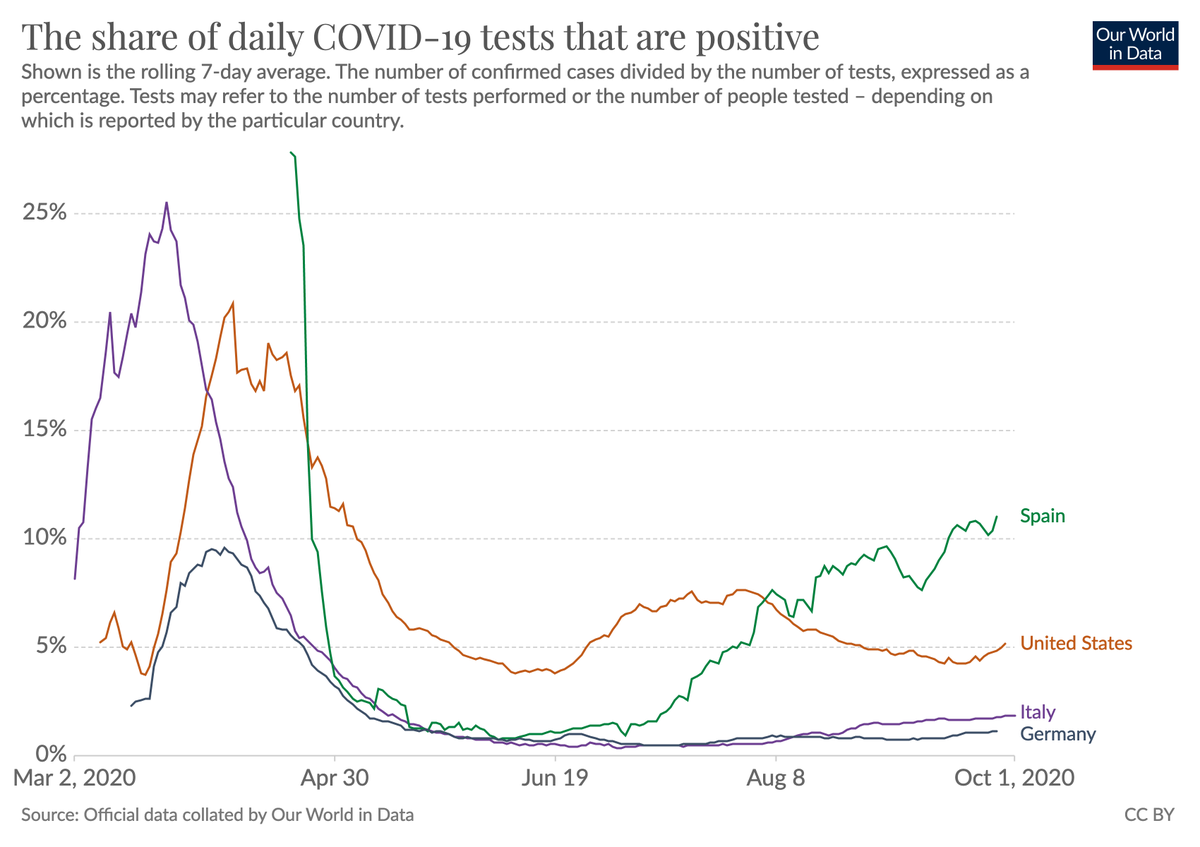 You see part of this in the testing data. Spain is still doing very poorly in testing, but in the first wave it must have been very, very bad. They have not published data so we can't know how it was. The first data point – very late in the first wave – shows >25% +rate.pic.twitter.com/NSgH1hrwCR