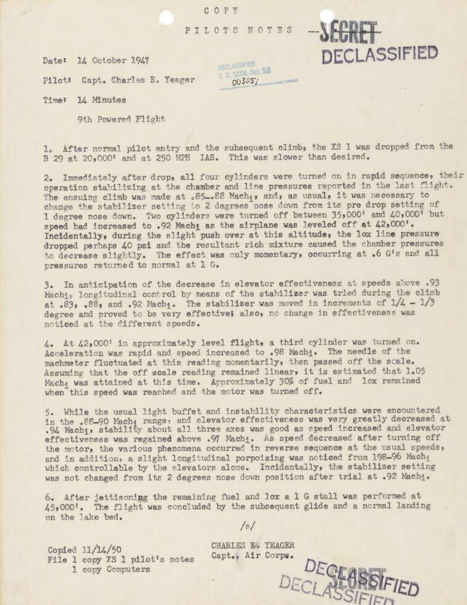 A historical curiosity: Yeager's typed signature block says he was "Capt., Air Corps"; the USAF had officially become a separate service the previous month. (The typist probably hadn't gotten the word.)