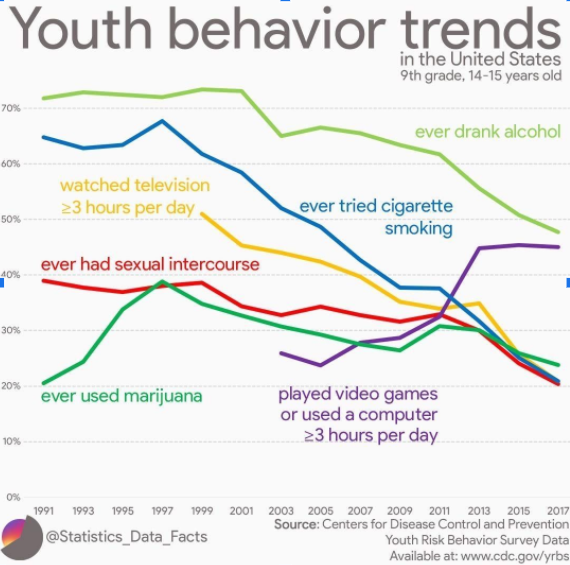 A study found the prevalence of gaming among youth to be inversely related to some more serious shenanigans https://www.reddit.com/r/dataisbeautiful/comments/f8c0uf/youth_behavior_trends_in_the_united_states_9th/ …pic.twitter.com/oRK8kQOgeu
