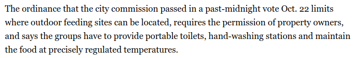 Fort Lauderdale man faces jail sentence for feeding the homeless. Rather than outright making it illegal, the city chose a "ban gruel" approach - raise standards of what is required high enough that he is forced to stop. https://www.sun-sentinel.com/local/broward/fort-lauderdale/fl-homeless-feeding-citations-folo-20141105-story.html … pic.twitter.com/fCPfFbGWbQ