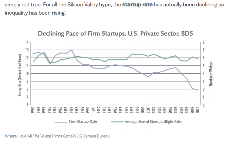 Journalists are often confused when they see a graph labelled "startups" that's going down. These statistics mean startups in the sense of foundings, not in the sense of a type of company. All they mean is that fewer companies of all types are being started.pic.twitter.com/SNzOWMpzBk