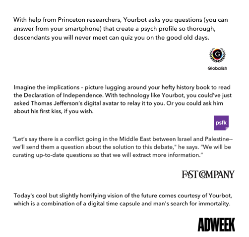 @paulg dear Paul, we believe that you need to see this: http://www.yourbot.com . "Timeless memories across generations"