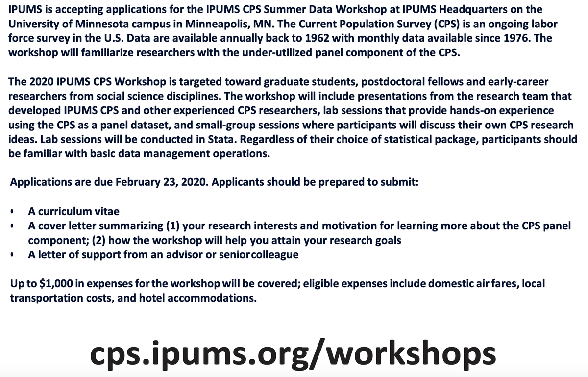 Help interested students apply for this great opportunity: a three-day workshop at the Minnesota Population Center on using the panel component of IPUMS-CPS. All expenses paid! I've attended multiple MPC workshops and they've all been incredibly useful. http://cps.ipums.org/workshops pic.twitter.com/KBUWW0pmPi