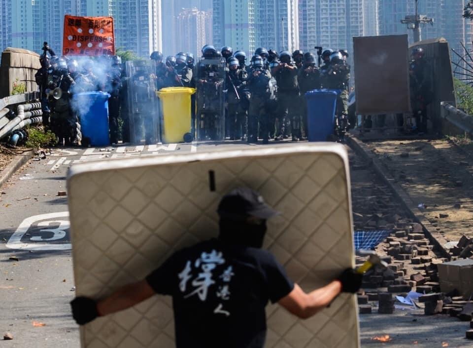A #HONGKONG protester uses a mattress from a dormitory nearby to shield himself from pepper-spray pellets & bean bag rounds fired by the police to end a pro-democracy protest in the CUHK!
