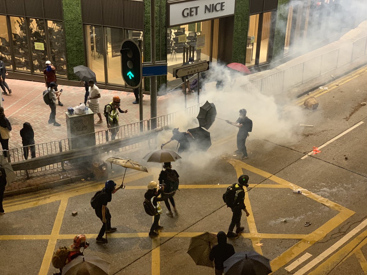 Scene at the front lines of the campus. The water is not easy to defy. Stings badly and has a lot of force behind it.https://twitter.com/jamespomfret/status/1196095177724583936?s=21 …