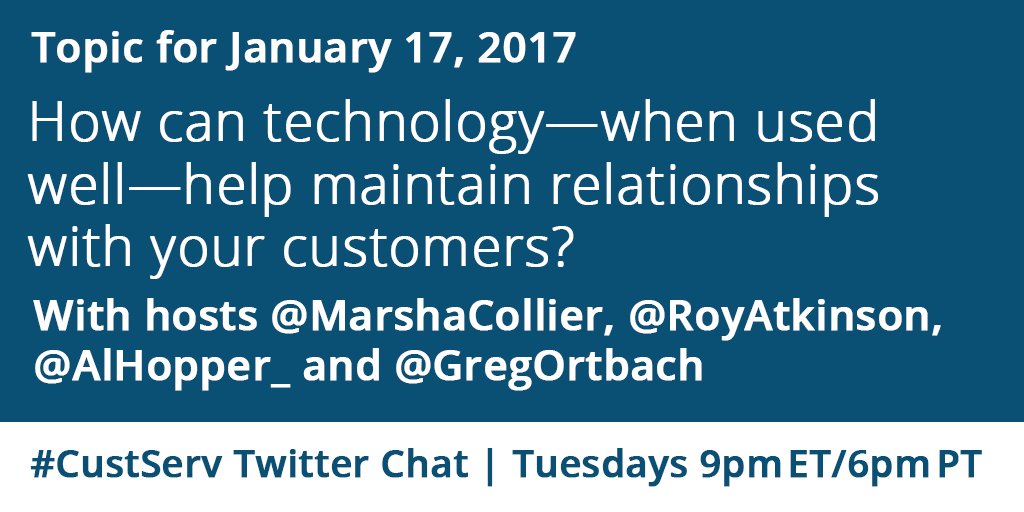 #custserv chat: “How can technology--when used well--help maintain relationships with your customers?” 9 pm ET w/@GregOrtbachpic.twitter.com/D291sP1jkA