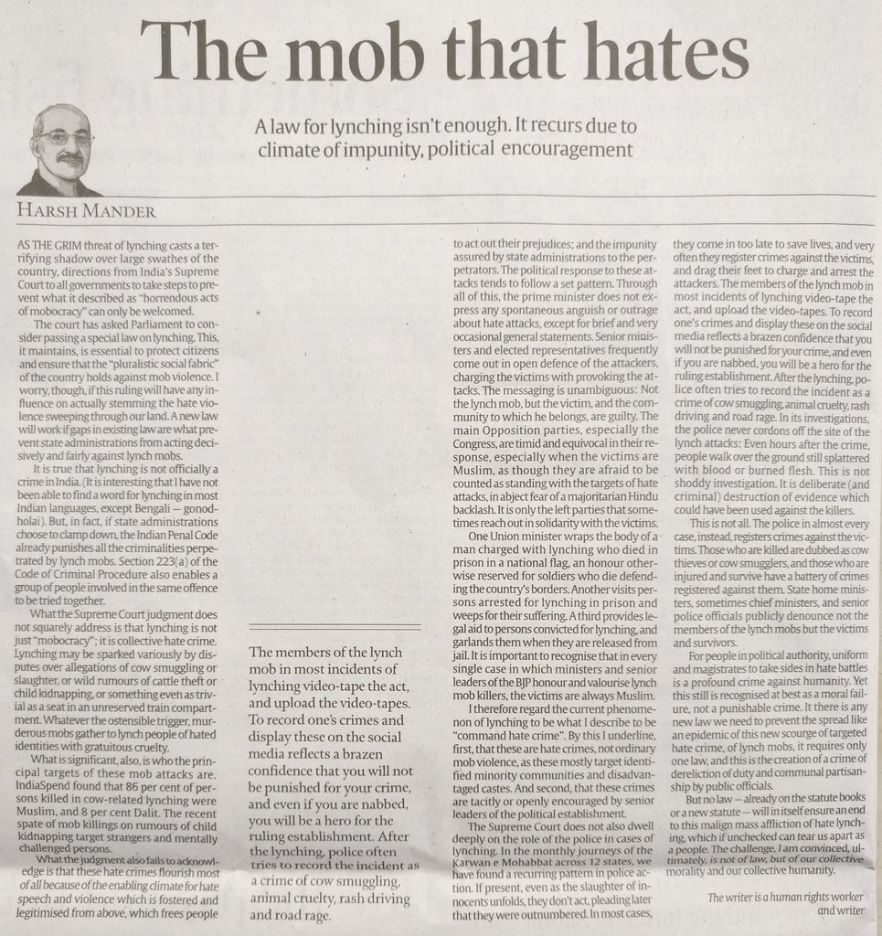 Must read: Why the fine judgement of the SC against Lynching & hate crimes may not be enough to stop these. They are actively abetted & encouraged by the ruling dispensation & police under their control. The criminals openly boast & are feted by Ministers, but victims are chargedpic.twitter.com/iJAZhXEoEf
