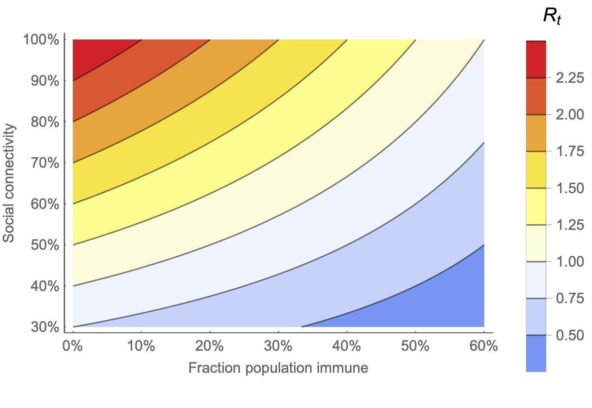 w/ heterogeneity of social connectivity and exposure, the picture is more complex. Indiv. towns and/or social communities may employ rigorous social distancing and have low immunity. w/ eventual relaxing of SD, they are at risk for clusters of infection even if Rt <1 overall