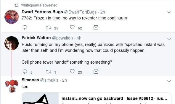 The system’s "monotonic" clock is sometimes not quite monotonic: https://github.com/rust-lang/rust/issues/51648 …. Should be worked around in 1.33https://github.com/rust-lang/rust/pull/56988 …