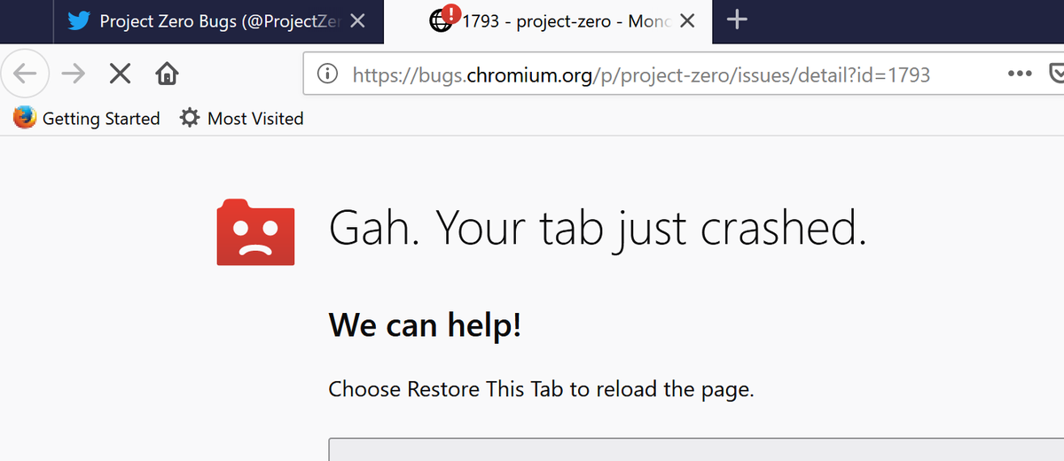 Ok this is a fun bug... in Firefox check out Sergeys Chrome: Integer overflow in NewFixedDoubleArray bug ... when trying to view the bug firefox will crash...https://bugs.chromium.org/p/project-zero/issues/detail?id=1793 …pic.twitter.com/kQYfjCuZxd