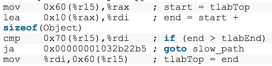 I think a lot of people don’t realize just how fast nursery allocations are in optimized GC implementations. Here’s the generated code for malloc in the HotSpot JVM. (Source: https://umumble.com/blogs/java/how-does-jvm-allocate-objects%3F/ …)pic.twitter.com/8yj2vGsjZQ