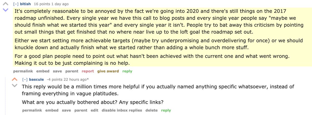 I agree that we should try to adapt and make our roadmaps as realistic as possible for the next go-round. Throwing around terms like “accountability” as if someone needs to be fired, or accusing the roadmap of being “marketing”, like that Reddit post did isn’t helpful, though.