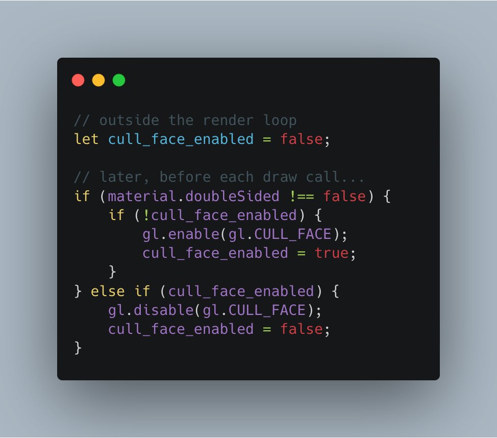 webgl lazyweb: is it bad to repeatedly call gl.enable(...) with the same value? e.g. should this code... if (material.doubleSided !== false) { gl.enable(gl.CULL_FACE); } else { gl.disable(gl.CULL_FACE); } ...be more like this? Or doesn't it matter?pic.twitter.com/eiS5ssVGEA