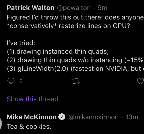 Other things I can think of but haven’t tried: (4) quads in geometry shader (5) quads in tess shader (6) two adjacent lines (7) conservative rasterization of line prims (NVIDIA only) (8) ditto w/ sliver triangles instead (NVIDIA+Intel) (9) (╯°□°)╯︵ ┻━┻ compute shader time