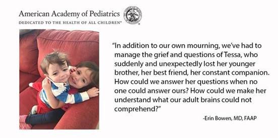 Medical training didn’t prepare Dr. Erin Bowen for the SUDC death of her son, or to support her daughter, Tessa, through the loss of her brother. In #AAPvoices, Dr. Bowen describes how pediatricians can help grieving families. #SUDCAwareness #SiblingLoss http://ow.ly/ByTk30nQpwS pic.twitter.com/jjd2wkK169
