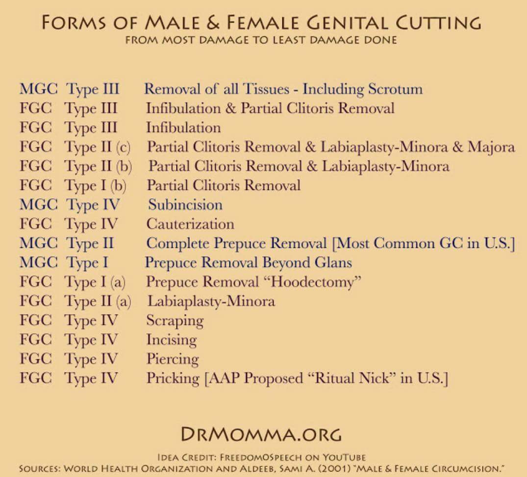 Not all FGM is infibulation, & not all MGM is circ. Regardless, any nonconsensual alterations involving a healthy person's genitals is a human rights violation. It's actually possible to equally condemn all forms and still acknowledge the varying degrees of damage they cause.pic.twitter.com/7a79HdXIzf