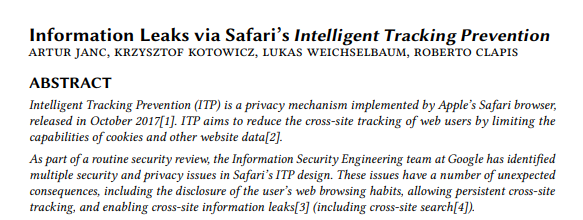 Our research on Safari's Intelligent Tracking Prevention (ITP) is now available on https://research.google/pubs/pub48871/ cc