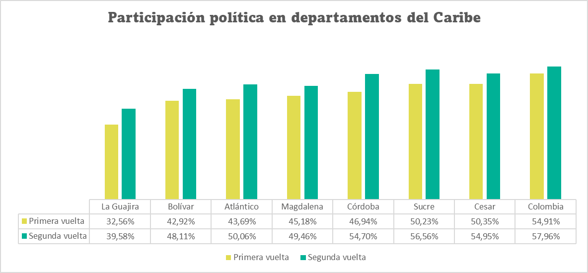 La participación política de todos los departamentos del Caribe creció más que en el promedio nacional entre la primera y segunda vuelta. Una parte de la victoria de