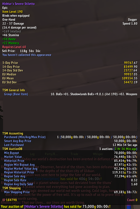 Don't forget to bump those material prices up, that are necessary for raid consumables! Also worth checking the Auction House for cheap BoEs. I snagged this BoE 12mins ago for 50k and flipped it for 75k - players maybe looking for that little boost to ilvl pre-raid.pic.twitter.com/nVTgQrW9hx