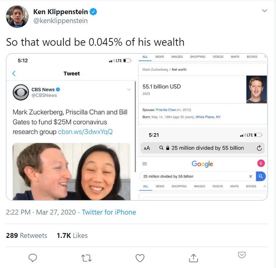 When someone evaluates a donation by what % of the donor's wealth it is, they're conveying that what they care most about is not how much *good* it does for others, but how much *pain* it caused the giver. That's their standard of morality.https://twitter.com/peterpham/status/1243658310345097216 …